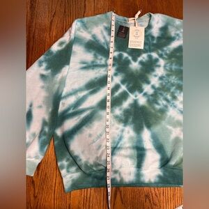 Stylish green tie-dye sweatshirt with a heart design. Perfect for casual wear.