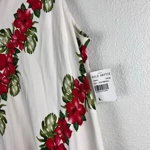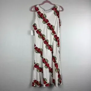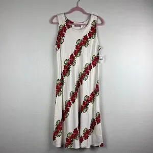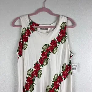 New with tags Hilo Hattie Hawaiian midi dress in a cream base with red hibiscus flowers and green tropical leaves. Sleeveless, flowy silhouette with a relaxed fit—perfect for summer, vacation, or resort wear.