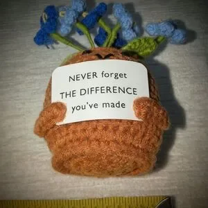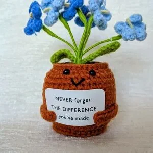 Adorable crocheted pot with blue flowers. Features a motivational message.