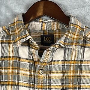 Lee Mens L Plaid Flannel Button Down Shirt Ivory Yellow Black Cotton Casual