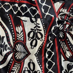 Brand new with tags Farm Rio Passion scarf-print wrap mini dress in a striking white base with black and red graphic detailing. Inspired by retro ’70s scarf motifs, this eye-catching piece features a true wrap silhouette with side tie closures finished with dangling bead accents. Versatile design can also be styled open as a tunic top over denim or shorts.