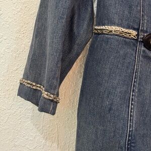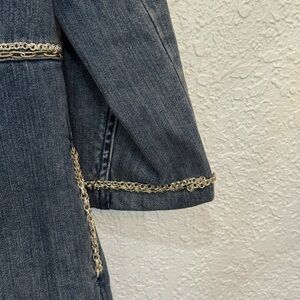 Chic denim jacket with stylish silver accents. Ideal for casual wear. A stain on the ones lining as shown in picture. Not visible from outside. No size tags but fits like a medium. Feel free to ask for measurements!