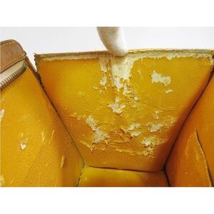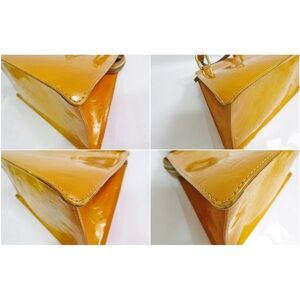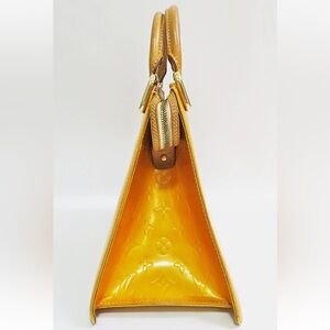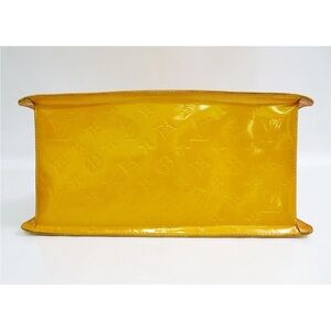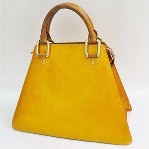 Stylish yellow satchel with iconic monogram. Features elegant gold hardware. Perfect for adding a pop of color.