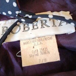 Vintage. Made in the USA. Semi-sheer navy blue with white dots. Beautifully designed. Cut in shoulders, seam under chest. The back is so pretty: a cat's cradle laces up the back. Back zip, fully lined. Size 7/8 measures 36 at chest, 30 at waist, 40 at hips. 53 long from shoulder to hem. 62 at bottom hem, for added twirl. One of my favorites, you'll love it too.