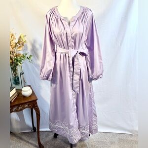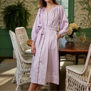 Soft, feminine, and effortlessly elegant, this Lake lavender midi dress features a full button-front design with a softly gathered neckline and relaxed silhouette. Designed with long balloon sleeves with elastic cuffs, a removable self-tie waist for customizable shape, and functional side pockets. Finished with ivory raised corded appliqué embroidery along the hem for a romantic, heirloom-inspired touch. Lightweight and comfortable for everyday wear, brunch, Easter gatherings, or spring occasions.