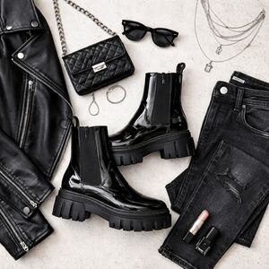 Designed with a chunky treaded sole, elastic side panels, and pull tabs for easy on/off, this style delivers effortless street-style attitude with all-day wearability. The glossy patent finish makes them perfect for soft grunge, Y2K revival, and edgy city looks.