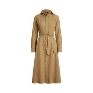 Linen button front shirtdress in Polo Tan with long sleeves, a collared neckline and a self tie belt. Midi length with an A line silhouette.