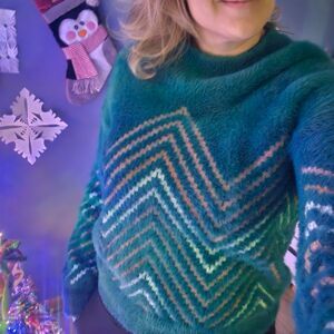 Super soft and stylish fuzzy knit sweater featuring a bold chevron zigzag pattern in teal, cream, and taupe. Warm, cozy, and perfect for fall + winter layering. Slightly relaxed fit with ribbed hem and cuffs. Great for pairing with jeans, leggings, or a cute skirt. Cozy, Chevron, Fuzzy Sweater, Retro, Winter Wear, Zigzag Pattern, Teal, 70s Vibes, Statement Sweater! Cabin core!