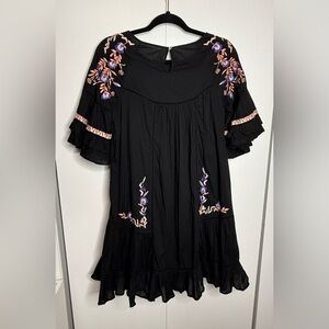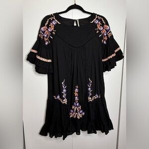 Free People - Pablo Dress - mini 3/4 sleeves, ruffles, embroidery. Black size small