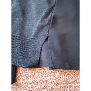 Elegant lightweight cardigan by Nic + Zoe in classic black. Features a deep V-neck, full button front, and a beautiful sheer chiffon back panel that adds movement and a layered look. Soft knit front and sleeves with ribbed cuffs and hem. Flowy, longer length, perfect for office wear, travel, or dressing up a simple top. Can be worn open or buttoned.