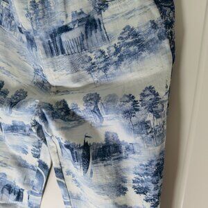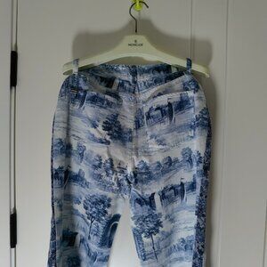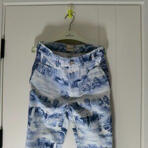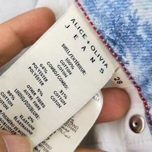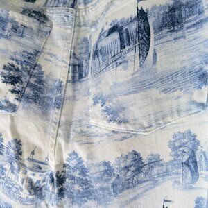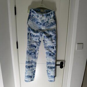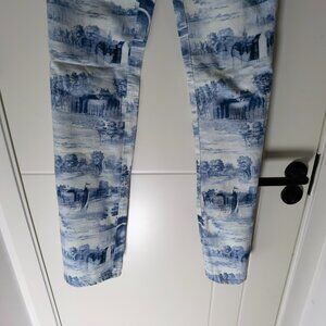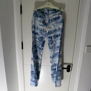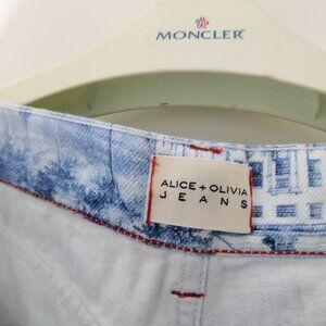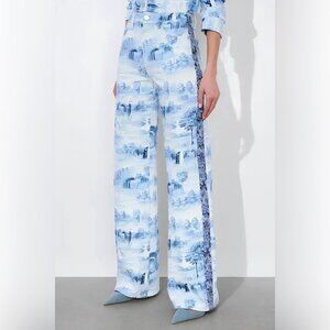 The Alice + Olivia Weezy jean is tailored from premium denim patterned in a toile motif. These jeans have a high-rise and a streamlined wide-leg. Jacquard panels are featured along the side seam. It features a front button and zipper closure. The front rise is 11 1/4" and the inseam is 34 1/2". It is digitally printed and made of 100% cotton. Dry clean only.