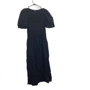 Chic black midi dress with puff sleeves. Square neckline and smocked bodice. Perfect for versatile styling.