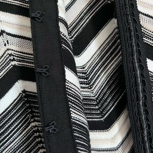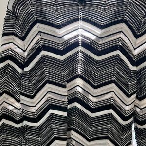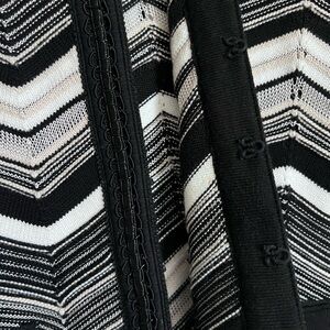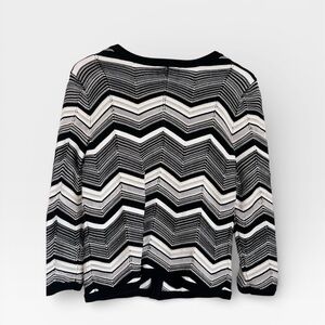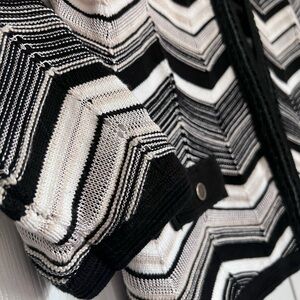 Elegant semi-sheer cardigan with a striking zigzag design. Features a classic black and white color scheme with light tan and gold stitching. Ideal for layering.