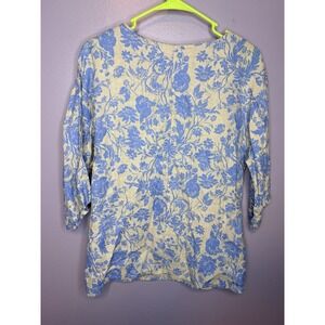 Keywords: Laura Bianchi, linen blend, floral print, blue white, V neck, button front, 3/4 sleeve, Made in Italy, boho, casual, resort wear, vacation, breathable, lightweight
