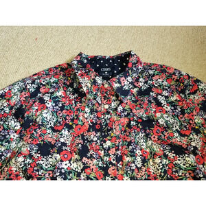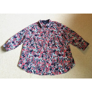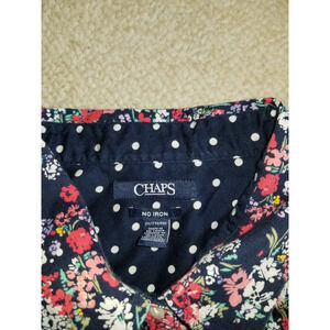 Women's Top-CHAPS BY RALPH LAUREN- Lovely women's navy, white, pink, green, yellow, aqua, coral and purple ditzy floral 100% cotton button-up "No Iron" blouse. Blouse has a round collared neckline, full front button closures, no pockets, 3/4 sleeves, and is not lined. 100% Cotton. Marked Size: 2X (Underarm-to-Underarm= 25 inches, Length= 30 inches). Excellent condition. Non-smoking home. Thanks for looking.