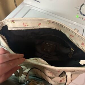 Chic Coach tote with floral design. Cream background with pink flowers. Ideal for everyday elegance.