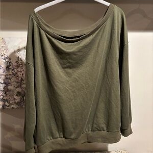 Casual olive green sweatshirt with 'Love' graphic. Perfect for a relaxed look. Can have it hang off one shoulder or a baggier styled look.