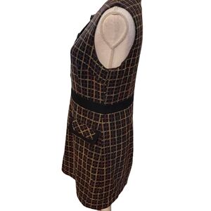 Sophisticated Anthropologie Slate & Willow Kristen dress in size small featuring a rich multicolor tweed pattern with autumn-inspired hues. This mod-style sleeveless dress showcases decorative button details down the front and a fitted silhouette with contrast black trim at the waist.