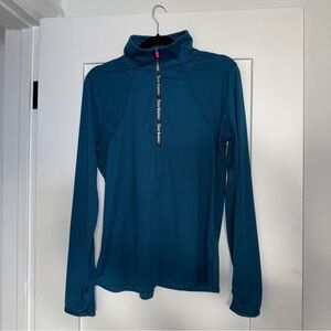 Stylish teal long sleeve top. Features a half-zip design. Perfect for workout wear.
