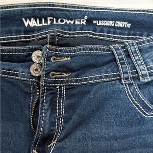 Stylish dark blue flare jeans by Wallflower. Comfortable fit with a modern flair.