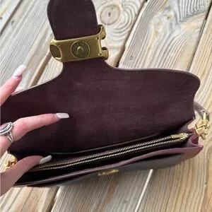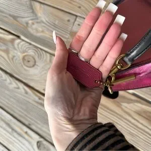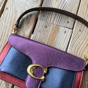 Elegant Coach clutch with bold red, deep purple, and classic black leather. Features signature gold hardware. Ideal for chic outings.