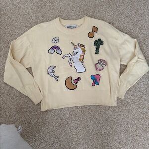Wildfox Unicorn sequin patch graphic sweater in pale yellow color. Long sleeves crew neck sweater with ribbing around the neck and cuffs.