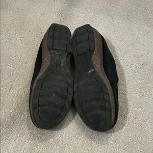 Step out in style with these sleek black leather slip on shoes. Perfect for any occasion, they offer both comfort and elegance. Women’s size 9, preowned condition with some signs of wear