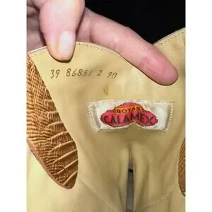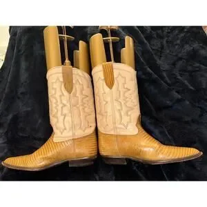 FROM CALAMEX, TWO TONE COWBOY BOOTS WITH STITCHING AND LIZARD GRAIN. THE SOLE SAYS SIZE 37, BUT THESE MEASURE ALMOST 11" LONG TO THE VERY POINTED TOE SO PLEASE GO BY THAT MEASUREMENT.