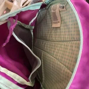 The North Face. Homeslice small backpack. Purple color. Inside is clean. Outside shows some wear. May be able to be cleaned. See all photos. No tears..