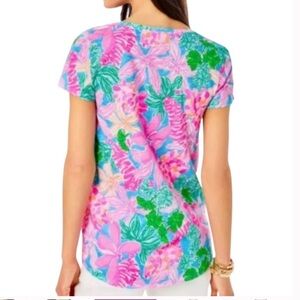 Lilly Pulitzer Etta V-Neck top in the "Multi Tigers Lair" print. It is an easy-fit, short-sleeve tee made from a 100% cotton slub jersey fabric with a high-low hem.