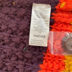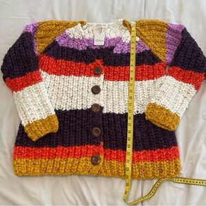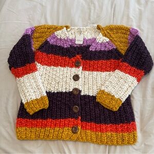 Vibrant knit cardigan with stripes of purple, mustard, red, and cream. Features button closure.