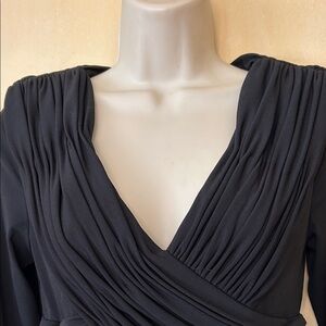 Eliza J black cocktail dress with long sleeves. Features a pleated jersey bodice with a portrait neckline and flowing satin skirt. The dress is fully lined with a layer of tulle for extra fullness. Perfect for a night on the town! Excellent condition