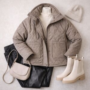 Designed in a soft taupe / earth grey tone, this jacket fits perfectly into today’s capsule wardrobe + utility-luxe trend. The wave quilting, high funnel neck, and relaxed silhouette make it ideal for everyday winter wear — from errands and travel to cozy city days. Easy to style with faux-leather pants, denim, knits, or athleisure layers.