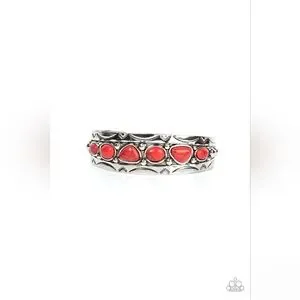 An asymmetrical collection of fiery red stones are encrusted across the studded center of a rustic silver cuff stamped in tribal inspired textures, resulting in an authentic centerpiece around the wrist.