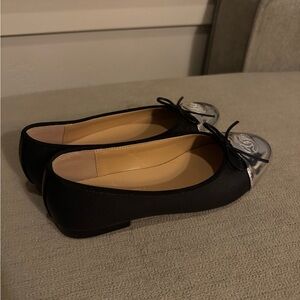 Stylish CHANEL flats with a sleek design. Black body with silver toe cap. Iconic logo detail.