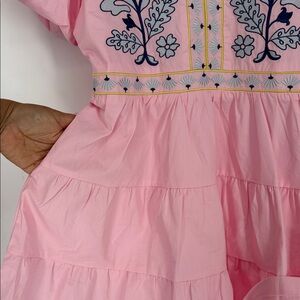 Adorable pink dress with floral embroidery. Features tiered skirt and short sleeves. Ideal for casual outings.