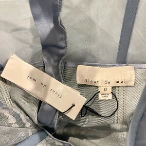 The Fleur du Mal Gabrielle Mini Dress features a bustier top with tweed-inspired embroidery and a denim skirt. The bustier top features scalloped underwire cups, chain button detailed, adjustable denim straps, and an exposed back zipper detail. The dress is a mini length. The body is composed of 99% cotton and 1% spandex. The combo is composed of 100% polyester. Lining 1 is composed of 90% nylon and 10% spandex. Lining 2 is composed of 92% silk and 8% elastane.