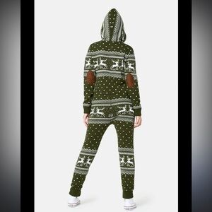 Cozy green knit jumpsuit featuring a charming reindeer pattern. Includes a hood and zip closure for easy wear.