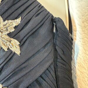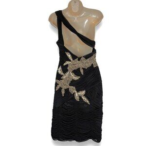 The dress is crafted with ruched black mesh, an asymmetric cutout back strap design, and metallic floral embellishments that catch the light without being gaudy. High-end construction, side zipper, and body-skimming silhouette make it ideal for formal events, parties, weddings, or holiday occasions.