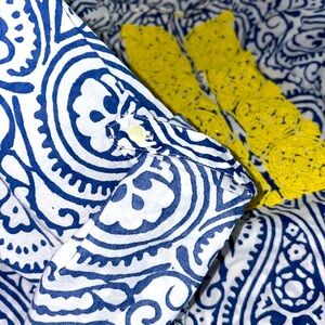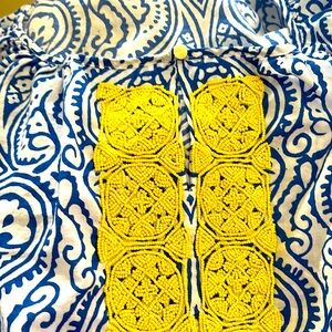Talbots Women's 2XL Tunic Blouse Beaded V-Neck Long Sleeves Blue White Cotton Yellow Beaded