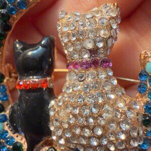 This charming cat brooch features two stylized cats seated together within a crescent moon shape, accented with multicolor rhinestones and gold tone detailing. One cat is finished in glossy black enamel, while the other sparkles with clear rhinestones and a soft pink collar accent. The moon is decorated with shades of blue, green, and aqua stones, adding depth and visual interest. Finished with a classic C clasp on the back for secure wear. Measures approximately 2” wide x just under 2” tall.