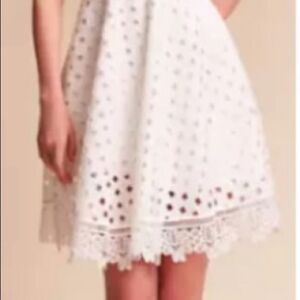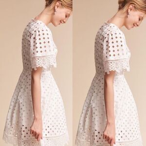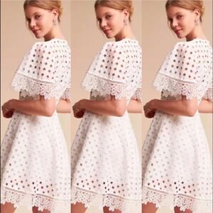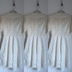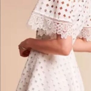 this flattering dress features a plunging v neck, short flutter sleeves, and an asymmetrical hem. Also worth noting: intricate guipure lace trim.