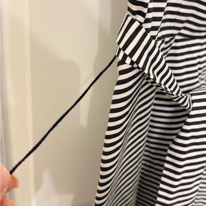 Chic midi dress with classic stripes. Features button-down front and adjustable straps. Includes a matching belt for a tailored look. Belt tie has broken on one side. See photo.