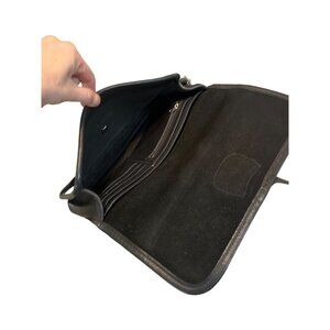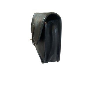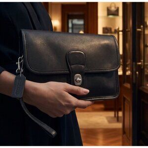 This vintage Coach turnlock clutch combines style and functionality with soft black leather, brushed nickel hardware, and a wristlet strap for easy carrying.