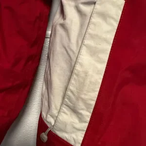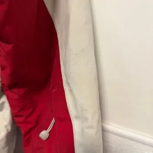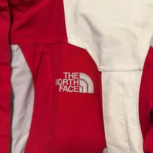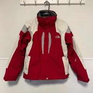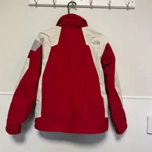 This pre-owned women's The North Face ski and snow jacket in size S features a red and white color block design with grey accents. It includes a removable quilted grey inner liner, a full-zip front with a Velcro storm flap, and a high collar with a hidden hood. Visible features include "HyVent" branding on the sleeve, multiple pockets, and adjustable cuffs. Signs of wear include minor discoloration and faint marks on the white and red fabric sections.