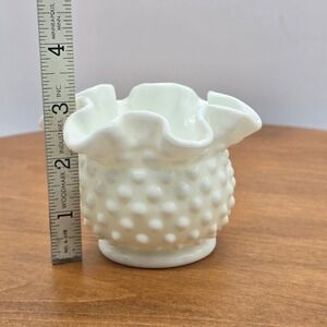 A charming vintage Fenton milk glass hobnail vase with a ruffled rim. This petite piece showcases the classic hobnail texture on its body, transitioning to a delicate ruffled edge at the top, perfect for adding a touch of vintage elegance to any space. The interior reveals a few minor specks, consistent with age and use.