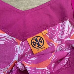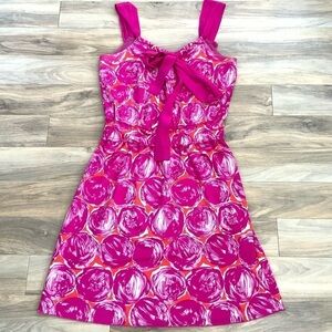 Tory Burch Cocktail Vacation Floral Beach Mini Dress Size Small Red magenta purple pink bright floral print abstract rose print Silk chiffon ribbon straps with large bow tie neckline Sleeveless Elastic stretch waist band Mini length Polyester Body / silk trim Excellent condition