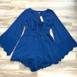 Francesca's Blue Rain Navy Embroidered Long sleeve Tie Knit Romper