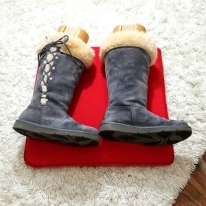 Stylish UGG combat boots. Gray suede with cream fur lining. Lace-up design.