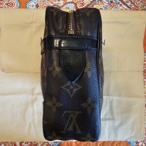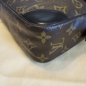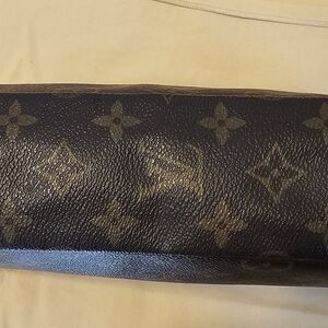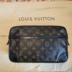LOUIS VUITTON Compiegne 28 Pochette. Louis Vuitton monogram canvas and leather. One open pocket outside. Two side pockets inside.
